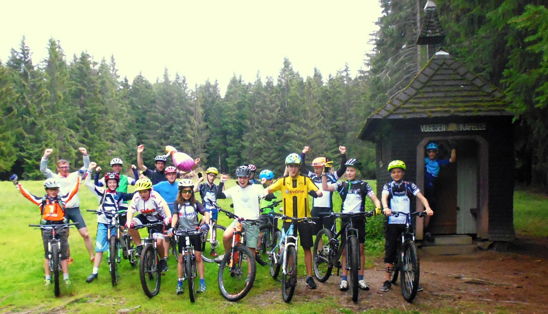 Am Sonntag unternahmen wir mit allen 20 Bikern eine Panoramatour zur Vogesenkapelle (9 km/120 Hm). In einer Waldlichtung gabs erst mal Vesper und zum gemeinsamen Abschluss noch 2 spannende MTB Spiele. Danach trennte sich die Gruppe, die einen fuhren wieder runter nach St. Märgen und 6 Nachwuchsbiker plus 3 Erwachsene nahmen den Kandelhöhenweg über St. Peter unter die Stollen. Nach 2,5 Std und knapp 30 km traillastiger Tour kamen alle (ziemlich) wohlbehalten an. Der Jüngste in der Truppe war erst 10!