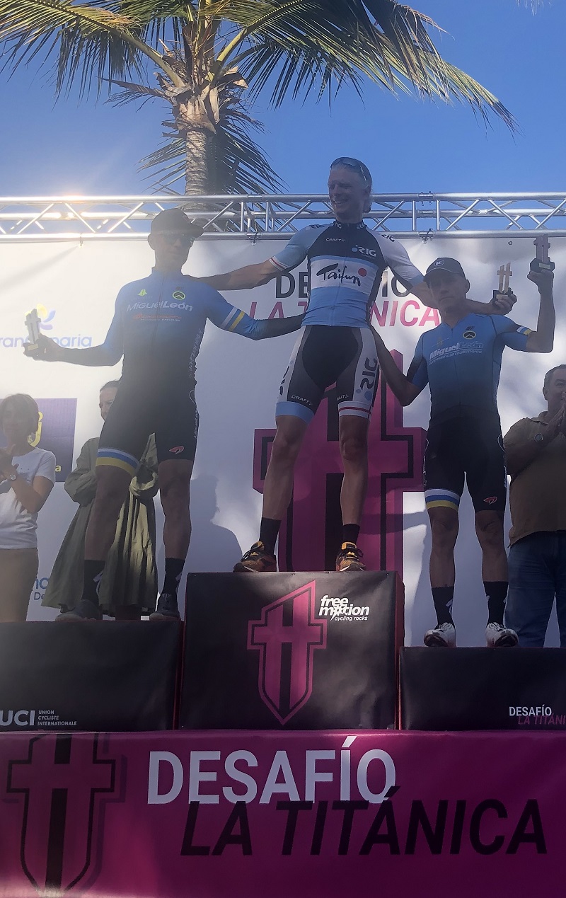 Zum Ende seines Trainingslagers auf Gran Canaria konnte Marc Reifferscheid beim Bergrennen „Desafío La Titánica“ den Sieg in seiner Altersklasse feiern. Das Rennen ging über 143km, wobei die Zeitnahmen jeweils an den 4 Bergen genommen wurden (2.3 km, 21 km, 12 km und 21 km). Als Höhepunkt des Rennens ging es als letzten Anstieg das „Tal der Tränen“ hoch (vale das lágrimas), bei dem ca.1500 hm mit Steigungsprozenten bis 20% zu überwinden waren. Hier konnte Marc seinen stärksten Widersacher auf Distanz halten und sicherte sich mit insgesamt 53 Sekunden Vorsprung nach allen vier Bergwertungen den obersten Platz auf dem Podest.