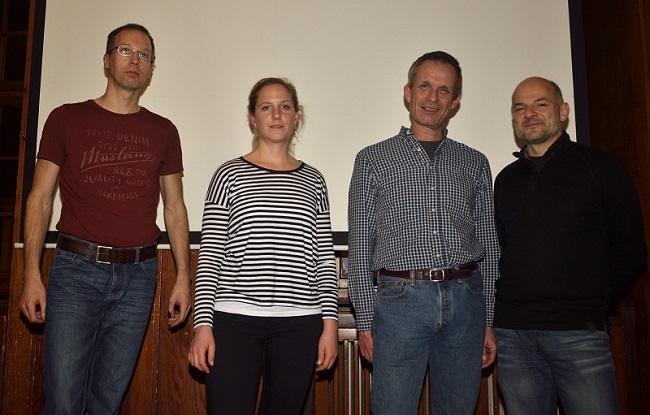 Neu (bzw. mit neuer Aufgabe) im Vorstand dabei: Philipp Müller (Beisitzer Straße), Berit Jurgenowski (Beisitzerin Frauenradsport), Michael Hotze (2. Vorsitzender) und Harald Gress (Jugendtrainier Rennrad). Alle weiteren Neugewählten waren leider verhindert. [Foto: Jürgen Pöhlitz]
