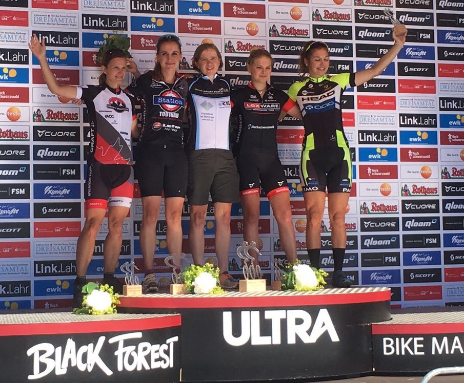 Nach ihrem Erfolg im Vorjahr gelang es Susanne Stampf (Bildmitte) auch diesmal, beim Ultra Bike in Kirchzarten den "Speed Track" über 51,6 km zu gewinnen. Nach 2:13,39 war sie als erste Frau über diese Distanz im Ziel. Herzlichen Glückwunsch dazu!